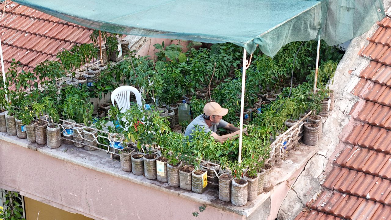 Terastaki bahçesi hakkında konuşan Salim Pektaş, "Burası iş yerimiz. Yazın işlerimiz yoğun olmadığı için kendimize bir meşgale bulduk. Ürettikçe de tadını aldık. Kışlık domates, biber, fasulye, patlıcan gibi ürünlerimizin yüzde 90'ını burada yetiştiriyoruz. Domatesimizi, biberimizi, fasulyemizi, her şeyi buradan alıyoruz. Beş senedir bu işi yapıyorum, ama son üç yıldır çatıda, terasta yapıyoruz. Daha önce arka bahçede yetiştiriyorduk. Burası olmasaydı, yazın herhalde kafayı yerdik. Çünkü yazın 3-4 ay neredeyse hiç işimiz olmuyor" dedi.