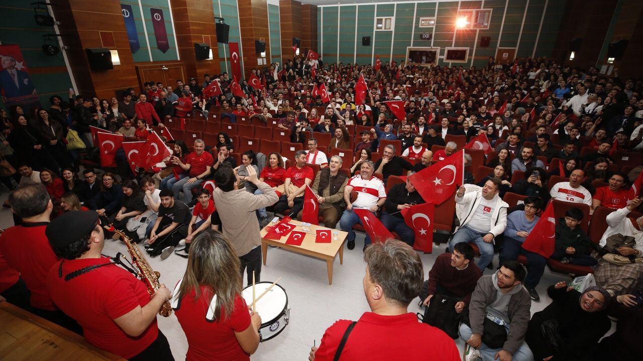 Tarihi play-off finali için saatler öncesinden salonu dolduran futbolseverler, oturacak koltuk kalmayınca merdiven boşluklarında ve yerlerde maçı izledi. Salon kapasitesinin yetersiz kaldığı heyecan dolu gecede, bando takımının çaldığı İzmir Marşı ve İstiklal Marşı ile coşku zirveye ulaştı. Tek yürek olan öğrenciler, maçın son düdüğüyle birlikte 2026 Dünya Kupası biletinin sevincini doyasıya yaşadı.