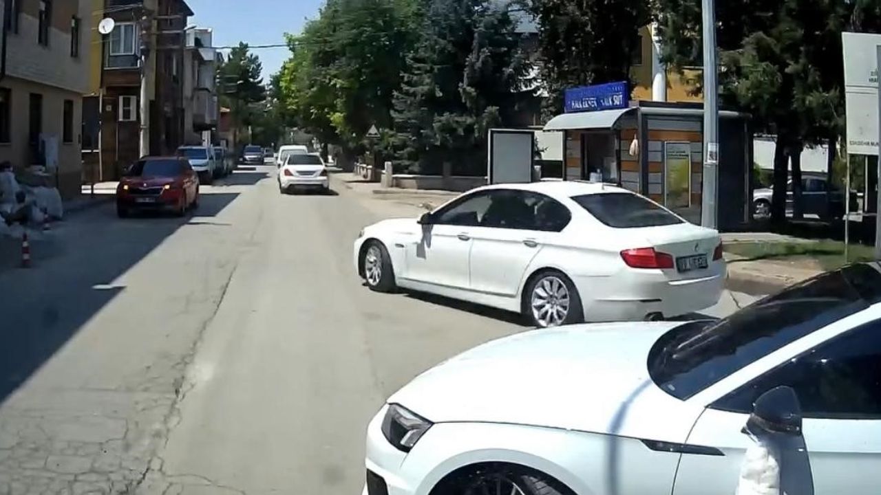 Eskişehir'de iki sokak kesişimindeki kavşakta düğün konvoyunun rahat geçişi için yol kesen sürücü, trafikteki bir aracın araç içi kamerasına yansıdı.