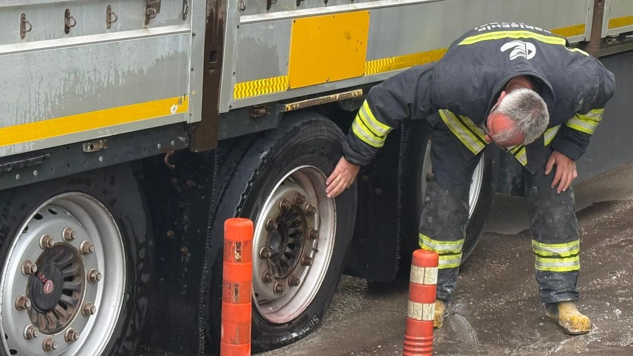 Tekerden çıkan yoğun dumanı fark eden tır şoförü, aracını hızla ana yoldan çıkartarak tali yola çekti. Durumun 112 Acil Çağrı Merkezi’ne bildirilmesi üzerine olay yerine vakit kaybetmeden polis ve itfaiye ekipleri sevk edildi.