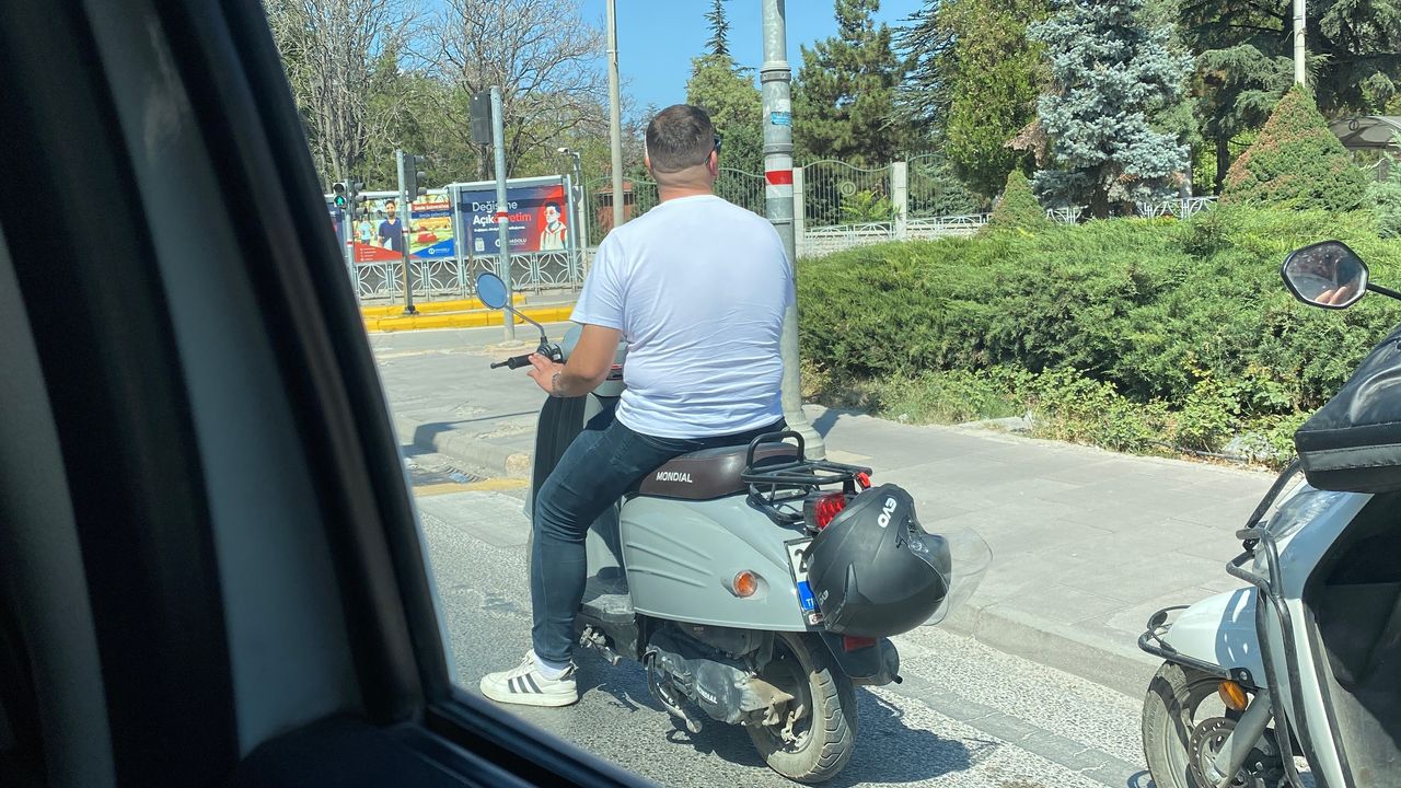 Eskişehir'de kafasına takmadığı kask ile motosikletinin plakasını kapatan motosiklet sürücüsü dikkat çekti.