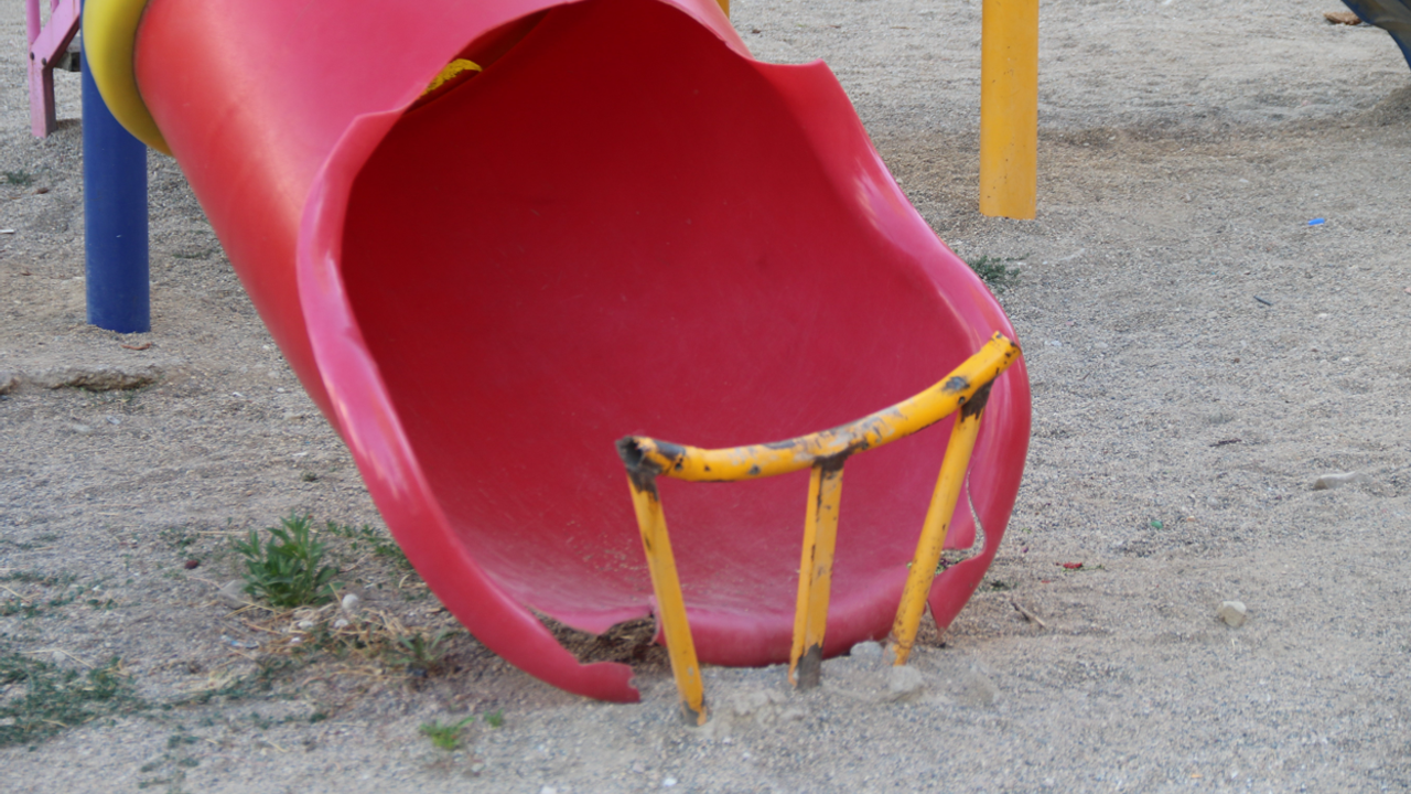 Kaydırağın sonunda fark edilmeden kayan bir çocuğun, demir korkulukla çarpışma ihtimali ciddi tehlike oluşturuyor. Bu durum, parkı kullanan çocukların güvenliği açısından büyük risk taşıyor.